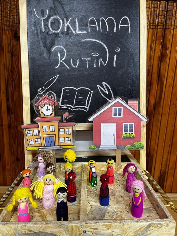 4 yaş B sınıfı ve öğretmenleri Burcu ÇAKIR yoklama rutinini daha keyifli hâle getirdi. Çocuklar kendilerini temsil eden figürleri ev ve okul maketleri arasında hareket ettirerek sınıfa katılım sağlıyor. Bu etkinlik sayesinde hem yoklama süreci eğlenceli geçiyor hem de öğrencilerimizin sorumluluk bilinci gelişiyor.